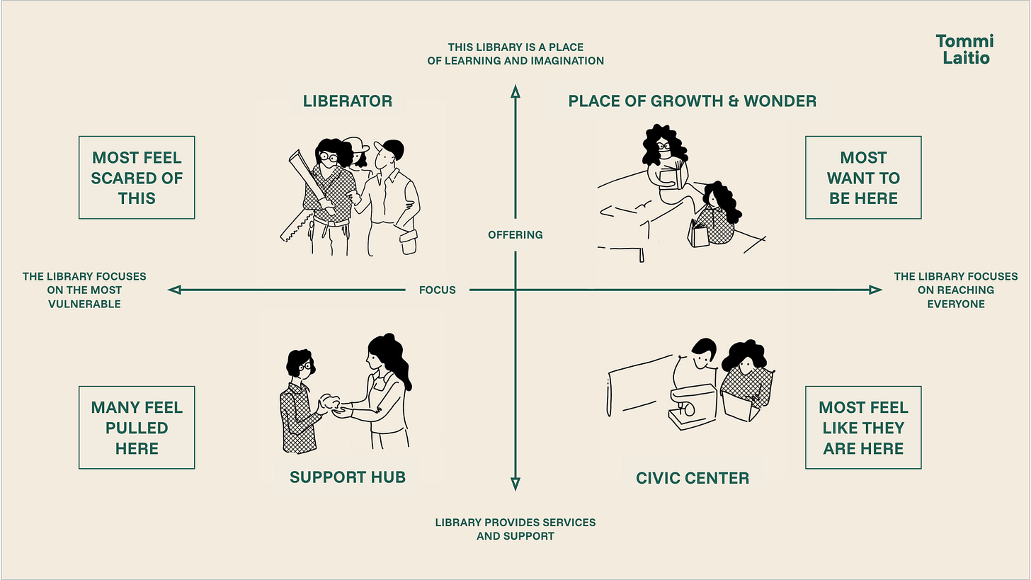 Basically I ask two questions: do you focus on relationships or services and do you strive to reach the most vulnerable or everyone? Is your key metric of success that everyone uses the library or that those with greatest need get the help they need? These questions create four possible library profiles: Place of Growth and Wonder, Civic Center, Support Hub and Liberator.